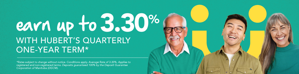 *Rates subject to change without notice. Conditions apply. Average Rate of 3.30%. Applies to registered and non-registered terms. Deposits guaranteed 100% by the Deposit Guarantee Corporation of Manitoba (DGCM).